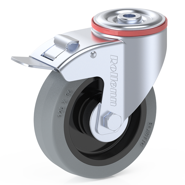 | Item Name | 125x36mm Braked swivel castor, Grey Elastic rubber, black Nylon rim, plain bearing,with hub caps | ||