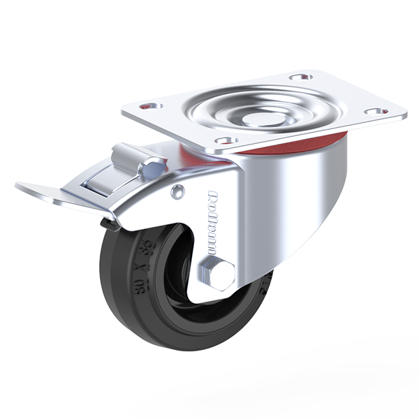 Item Name | 80X36mm Braked Swivel Castor, Black Elastic Rubber, Black Nylon Rim, Plain Bearing | ||